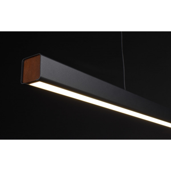 Підвісна LED люстра, корпус металевий. Мінімальна висота 15 см, максимальна висота 100 см, вбудовані світлодіоди, три кольори свічення (теплий, холодний, нейтральний), кріплення до стелі на планку, основа розміром 6х45 см.
